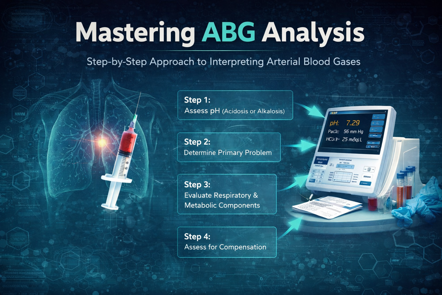 Arterial blood gas (ABG) analysis evaluates acid–base balance, ventilation, and oxygenation. This guide shows a reliable, repeatable workflow you can use at the bedside and while studying.