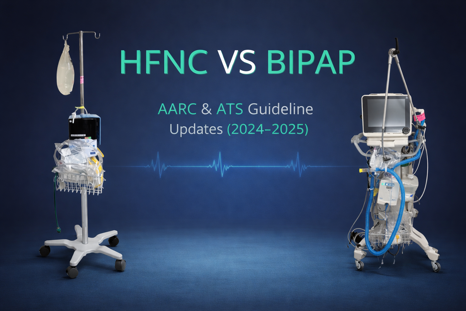 Evidence-based comparison of indications, starting parameters, escalation and failure criteria, and the latest study signals including RENOVATE 2024, AECOPD 2024, and post-extubation obesity data. This guide is designed for respiratory therapists, ICU clinicians, and students who want a practical bedside framework for choosing between high-flow nasal cannula (HFNC) and BiPAP/NIV.